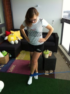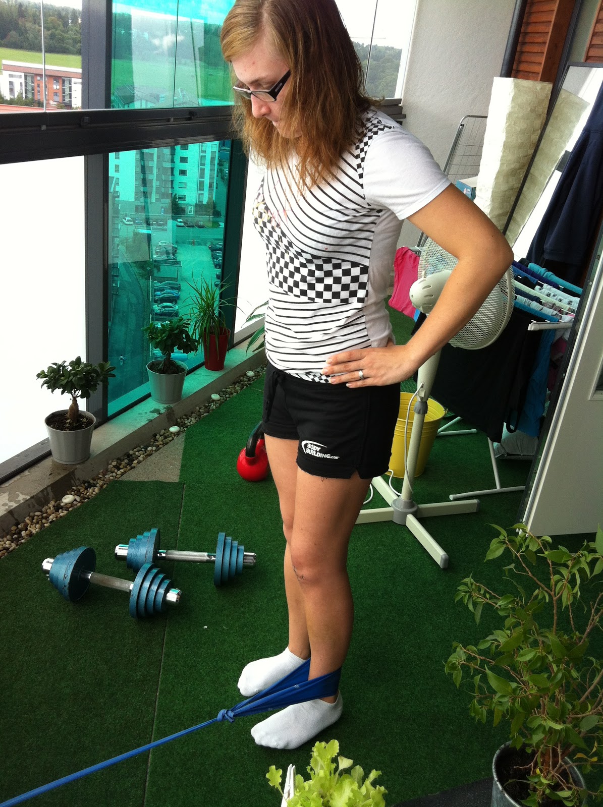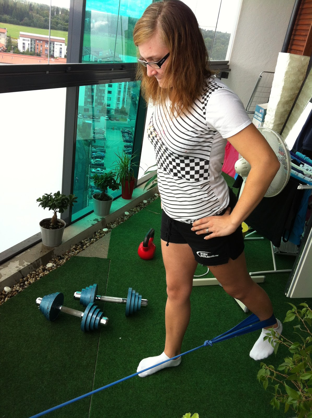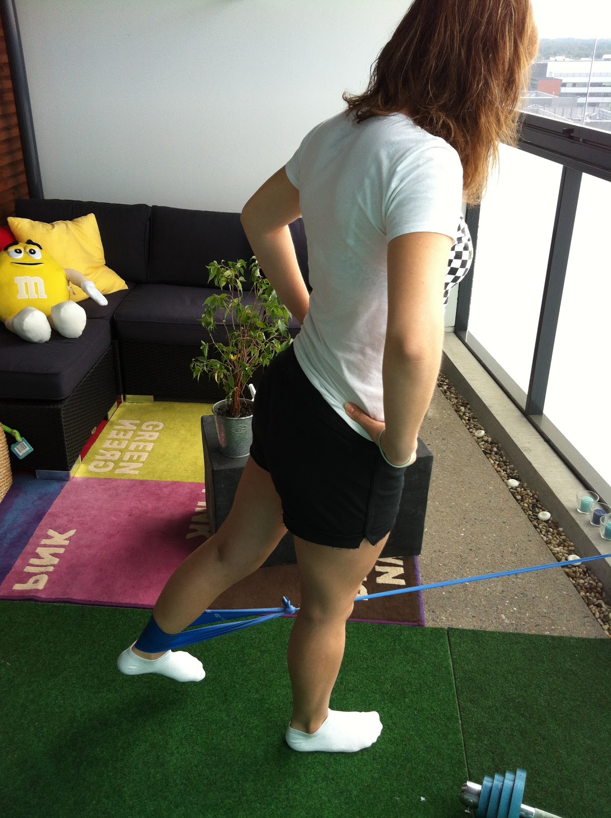 Toinen liike, kick-back, herättelee mukavasti leikatun jalan pakaran ja takareiden lihaksia. Olen tehnyt tätä ilman tukea, tasapainoharjotusta terveelle jalalle – saa olla tarkkana! :)