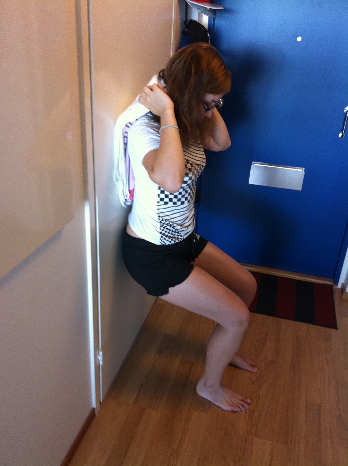 Seisten seinää vasten, nojaa palloon (tai mun tapauksessa huopaan :). Kyykkää niin syvälle kuin pystyt ja punnerra takaisin ylös. Keskittyen painopisteen pitoon keskellä!