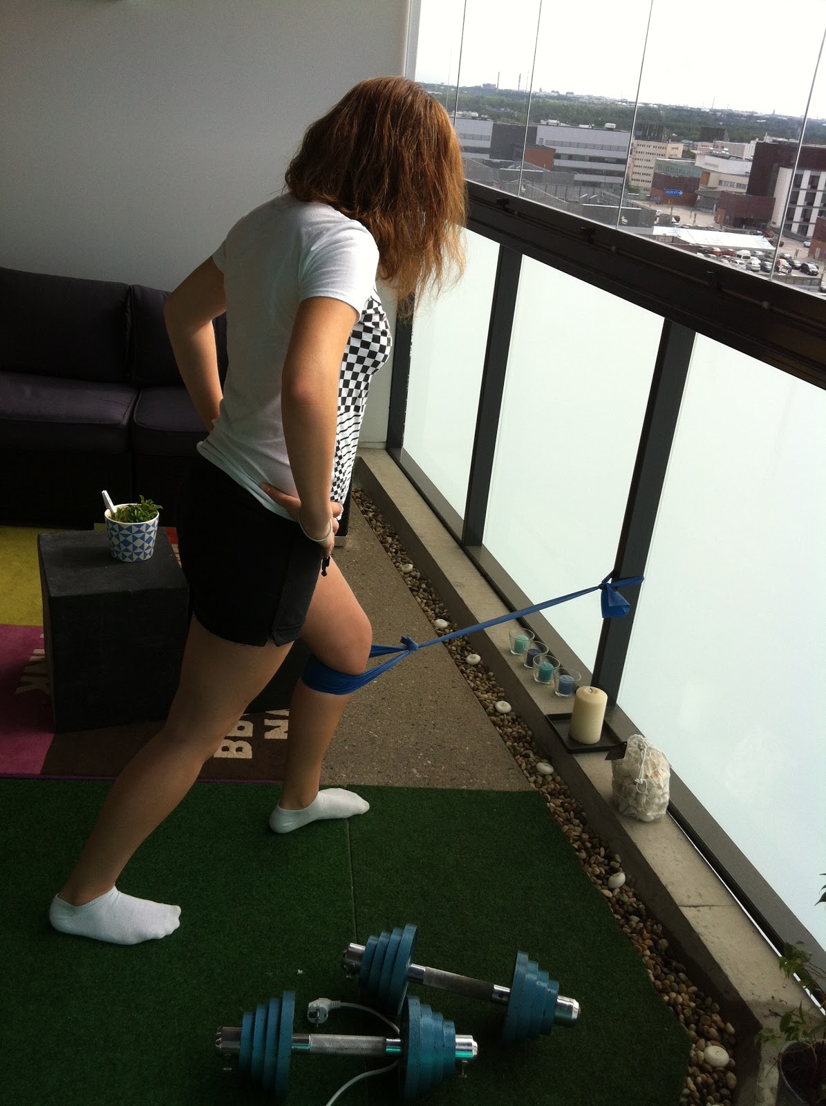 Teen kaikki kuminauhaliikkeet kiertotreeninä, eli en pidä pausseja liikkeiden välissä. Seuraavat kolme ovat hieman vaativampia, joten annan polven vähän rauhoittua ennen seuraavaa settiä.