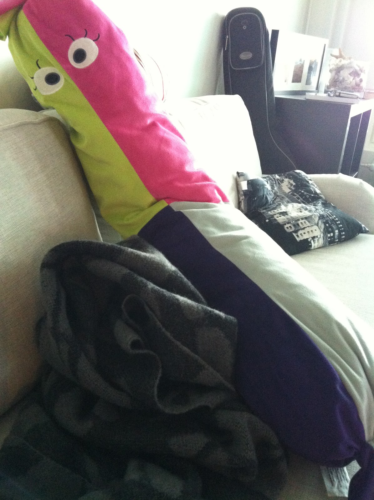 Kipeenä ei oo mitään ihanempaa kuin kääriytyä lämpimään huopaan sohvan nurkkaan. Lisäksi halaan aina tyynyä. Kuvassa oleva pitkä, värikäs ”nakki” on yksi parhaista heräteostoksistani. Ikeaan lastenosastolta mukaan napattu tyymy on superperhmeä ! :)