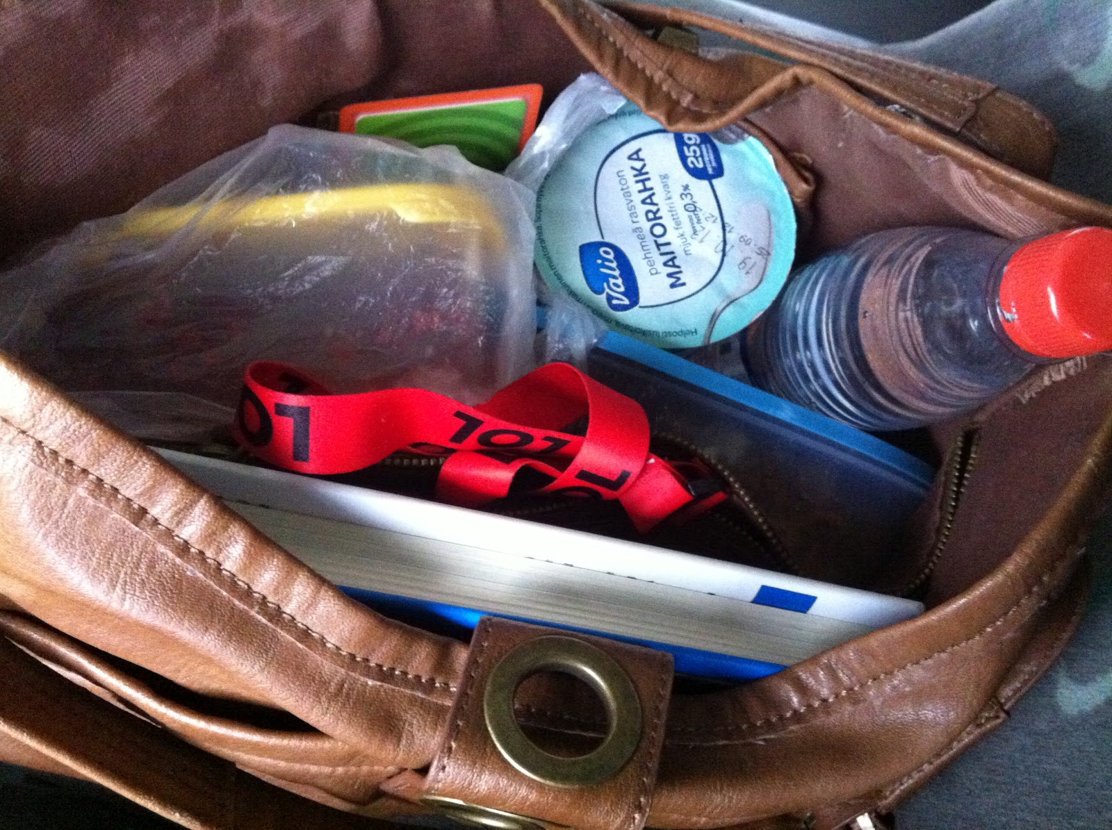 Laukkuun kurkkaus! Jillian Michaelsin -kirja, rahkaa, vettä ja ruuat! Muuta turhaa sinne ei mahdukkaan. :)