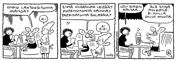 ”Eräässä ravintolassa tarjoilija toi naisseurueelle ruokalistan ja sanoi ottavansa ensin juomatilaukset, sitten ruokarajoitukset ja vasta sitten ruokatilaukset. Eräs tarjoilija taas yksinkertaisesti poistui paikalta kun rajoitusvehtaus alkoi ja totesi tulevansa hetken kuluttua uudestaan.”