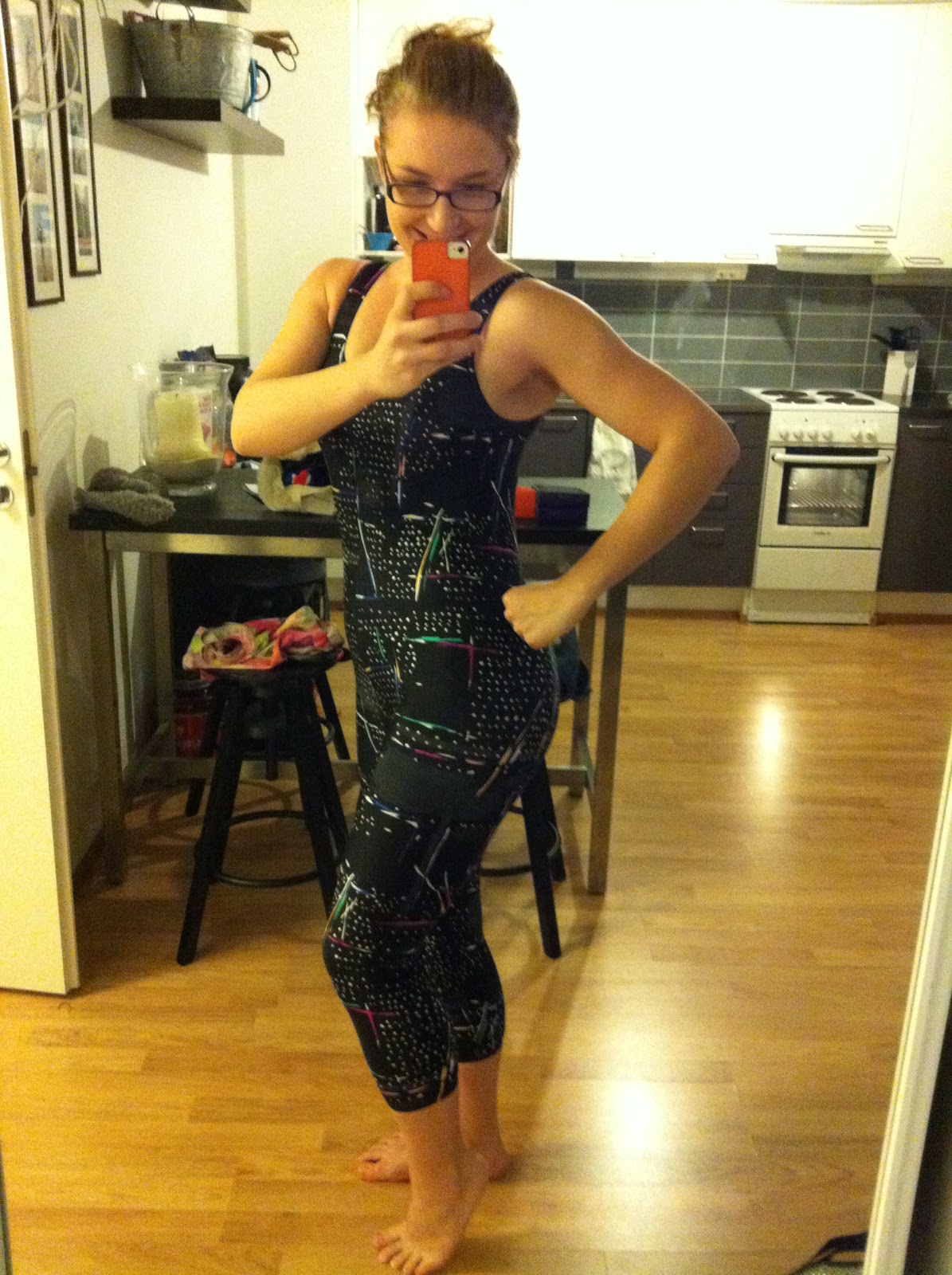 Heh! Kuinka helppoa oiskaan salille mennessä vetää kokopuku päälle ja matkaan? Ei ois pelkoa että kyykyssä putoaa housut tai juostessa nousee paita.. :D