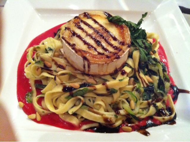 Moikka!Siinä on valkosipulipastaa, punajuurikastikkeessa. :) Vuohenjuusto päällä. Pinjansiemeniä, korianteria ja persiljaa seassa. Oli niin taivaallisen makuistakin! Mamma Rosasta Töölöntorin laidalta ;) Kiitos paljon, Hyvää Joulua myös sinulle!