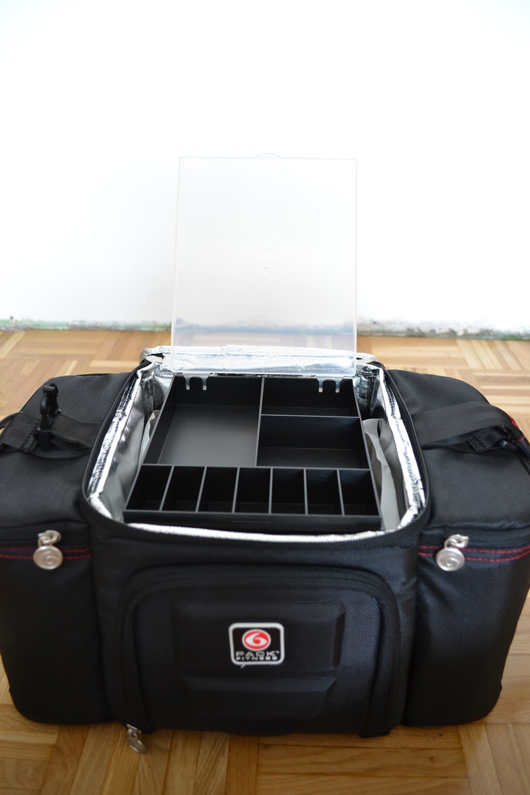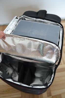 Kaikista tärkeimmät lokerikot löytyvät etupaneelin taskun takaa eli eväsrasioiden hyllyköt. Kuvissa olevat rasiat tulevat laukun mukana, joten huolta ei tarvitse kantaa mahtuuko omat rasiat laukkuun. Hyllyjen korkeutta pystyy säätämään, joten jos haluaa käyttää omia rasioita on sekin mahdollista.