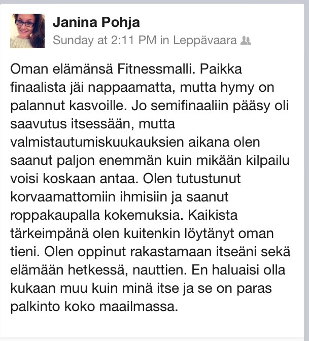 Miettiessäni valmistautumiskuukausia takaperin huomaan saaneeni kilpailulta juuri sen mitä lähdin hakemaan, ellen enemmänkin. Olen alusta alkaen ollut erittäin avoin tavoitteeni kanssa. En lähtenyt sitä piilottamaan epäonnistumisen pelossa, kuten aikaisemmin olisin tehnyt. Moni kyseli valmistautumisen aikana miksi haen kilpailuun mukaan. Monelle saattaa ensimmäisenä tulla mieleen vain ulkonäölliset syyt kuten hyväksynnän hakeminen tai itserakkaasti huomion haku. Itselleni nämä olisivat osuneet nappiin viime vuonna. Pidän luojan lykkynä ortopedini polvileikkauspäätöstä, joka esti oman hakemiseni. Olisin lähtenyt mukaan juurikin ylläolevin, mielestäni erittäin väärin, syin vaikka en sitä olisi sillon tajunnut tai halunnut myöntää. Vuoden aikana kerkeää moni asia muuttumaan ja itselleni kävi onnellisesti. Henkinen kasvuni on tapahtunut itselleni hieman salakavalasti, sen tajuaa vasta taaksepäin katsoessa. Tänä vuonna syyt olivat aivan toisia. Lähdin mukaan haastamaan itseäni; löytyykö kanttia? Kestääkö henkinen puoli? Itsekuri? Tahdonlujuus? Minne pääsisinkään jos antaisin kaikkeni?