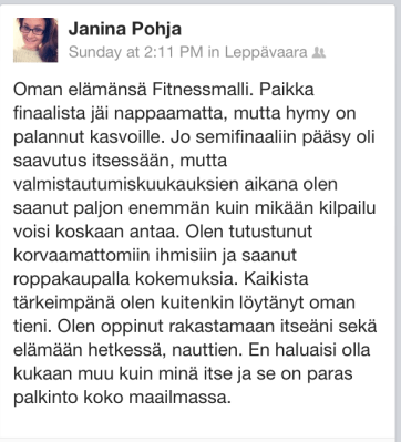 Yllättävän nopeasti saimme kuitenkin tunteita käytyä läpi. Kanssani samaan aikaan putosi mimmejä, joiden jatkosta olin varmempi kuin omastani. Syy putoamiseeni oli yksinkertainen: kroppa ei ollut siinä kunnossa missä se olisi pitänyt olla. Syitä voisi etsimällä etsiä ja voisin selitellä, en näe kumpaankaan syytä. Oma omatuntoni on puhdas: tein jokaisen treenin ja söin grammalleen ohjeiden mukaisesti. En olisi pystynyt siinä tilanteessa venymään yhtään enempää. Harmitus oli suuri, sen varmasti jokainen ymmärtää.