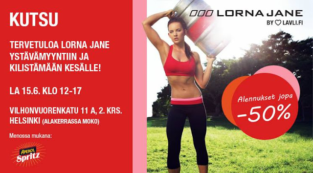 Haluaisin jo nyt, hyvissä ajoin, vinkata teille tulevasta tapahtumasta. Nimittäin Lorna Jane Ystävämyynnistä! Mikä olisikaan parempi tapa startata kesäloma ja saada puhtia kesätreeneihin kuin ostamalla uusia herkullisen värisiä treenivaatteita! Eipä taida olla voittanutta. Itse olen ainakin innoissani, sillä satun pääsemään töistä juuri sopivasti keritäkseni nappaamaan muutamat extra-motivaattorit.