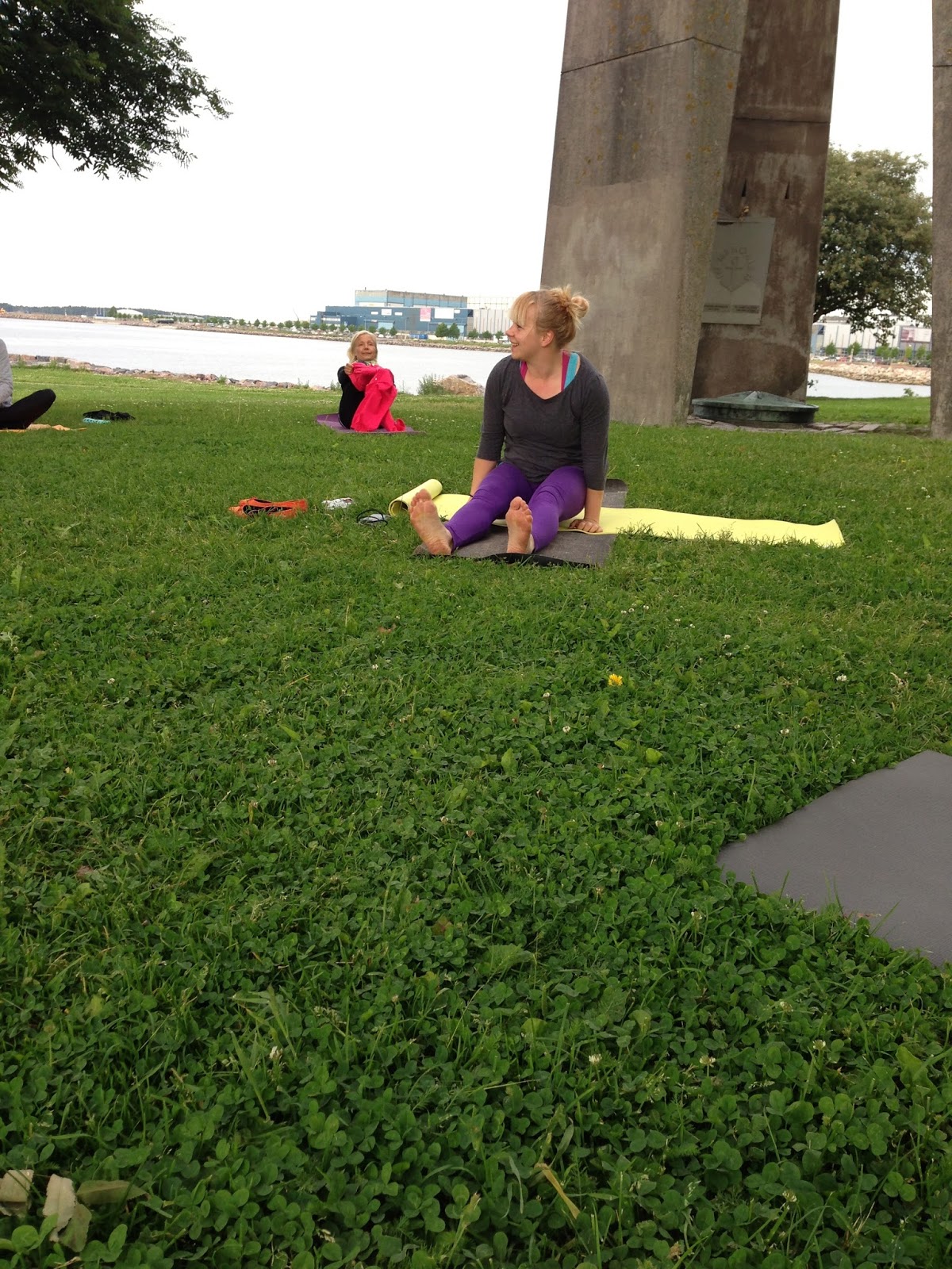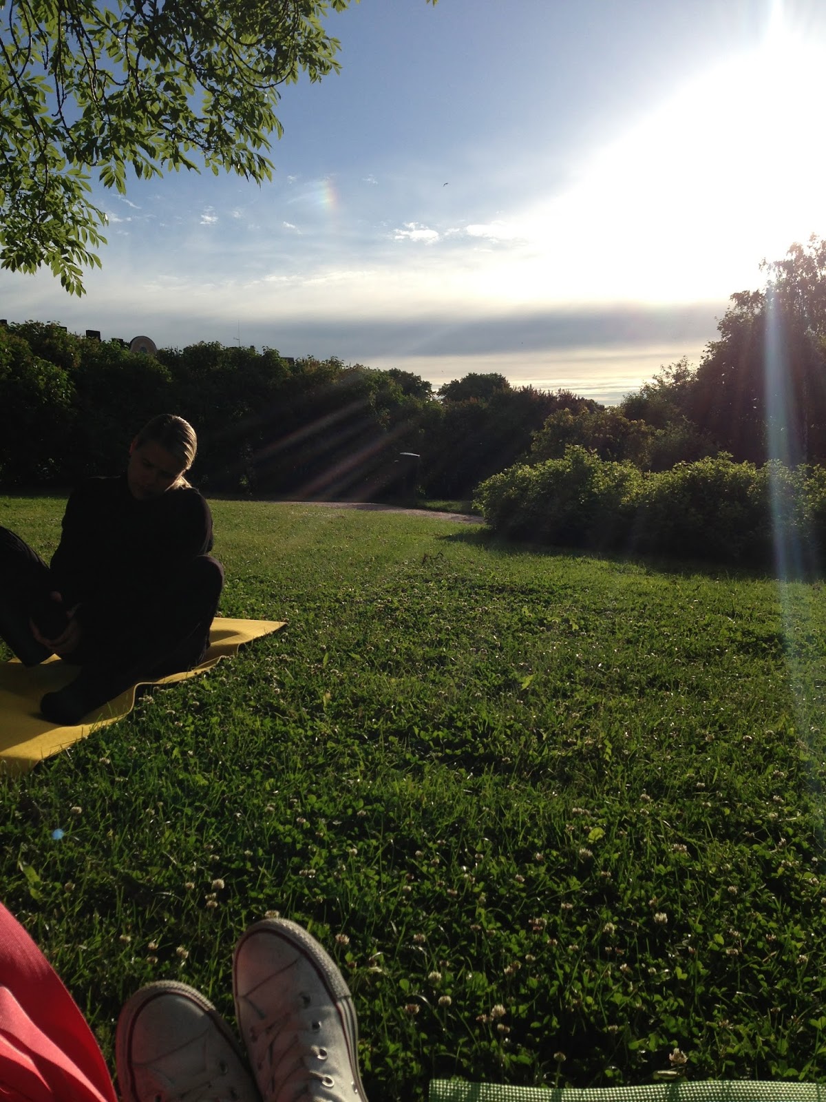 Kaiken ihanuuden ja rauhoittumisen lisäksi tämä tunti oli ilmainen. Kyseessä on kolmen naisen aloittama Yoga Goes Outdoors -ryhmä. He haluavat jakaa joogan ilosanomaa kaikille ja tekevät sitä kesäisin ulkona. Kuten aikaisemminkin sanoin, mielestäni idea on upea ja kaikkien kannattaisi käyttää hyväkseen näitä mahdollisuuksia! Paikat vaihtelevat ja heille saa ehdottaa paikkoja sekä ajankohtia. Tämän päivän paikkana oli siis Ikuisen Tulen Kalliot, jotka löytyvät Kaivopuiston rannasta ravintola Carusellin vierestä.