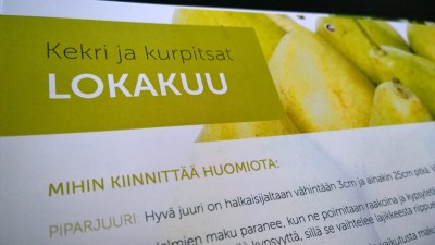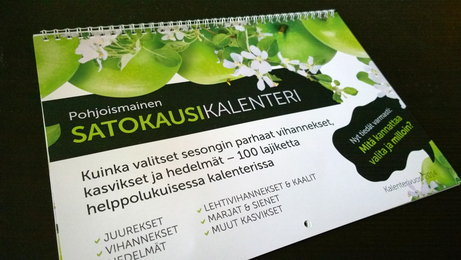 Eilen postiluukusta kolahti vastaus rukouksiini. Nimittäin Pohjoismainen Satokausikalenteri 2014! Vaikka kalenteriosuus on ensi vuoden, tulee tuo meillä heti käyttöön. Lautaselle päätyy tästä edes varmasti vielä monipuolisempi vihannesten kirjo!