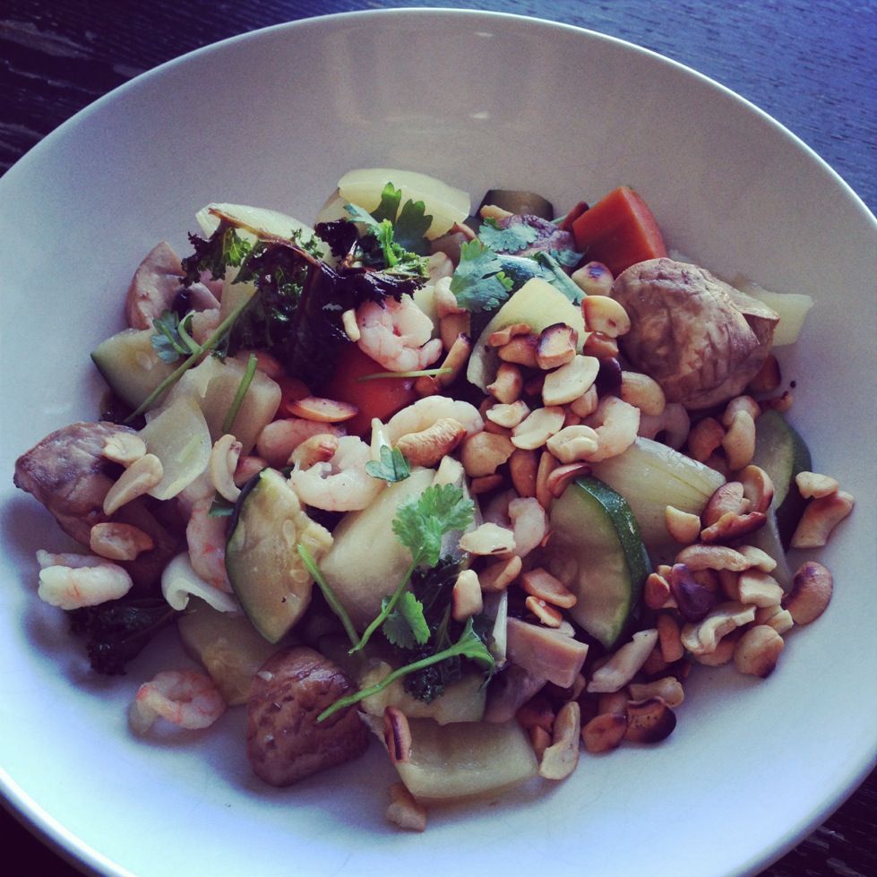 Se oli mukava hetki. Yksin, hymyillen. Ruoka maistui hyvältä, jokainen aisti oli paikalla. Korianterin raikkaus piristi katkarapu-vihannes -sekoitustani. Cashew-pähkinä toi mukanaan crunchia, joka tasapainoitti kesäkurpitsan pehmeyden. NAM.