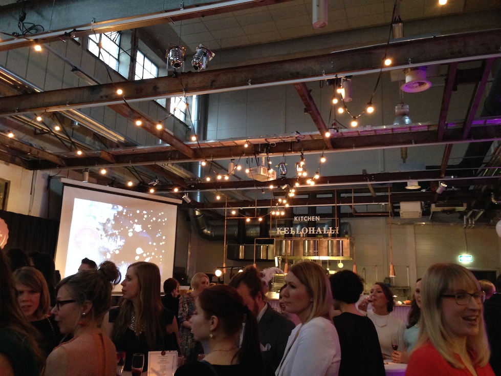 Gaala-paikkana toimi vanha teurastamo, Kellohalli. Rakastuin katon vanhoihin parruihin jotka oli koristeltu himmein lampuin. Ihana tunnelma. Olimme Ainon kanssa paikalla ajoissa sillä etuovi oli vielä lukossa. Onneksemme pääsimme kuitenkin sateesta sisään. Miten tällaisinä juhlapäivinä sattuu useimmiten satamaan kuin paistamaan? Minua jännitti vielä saapuessakin, mitähän tästä illasta tulisi?
