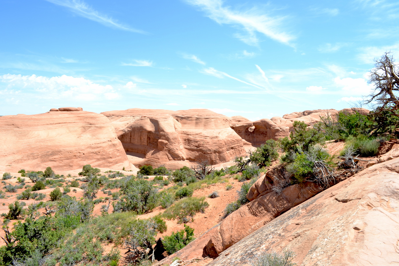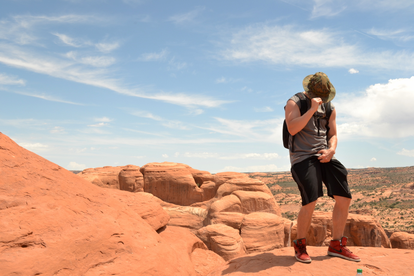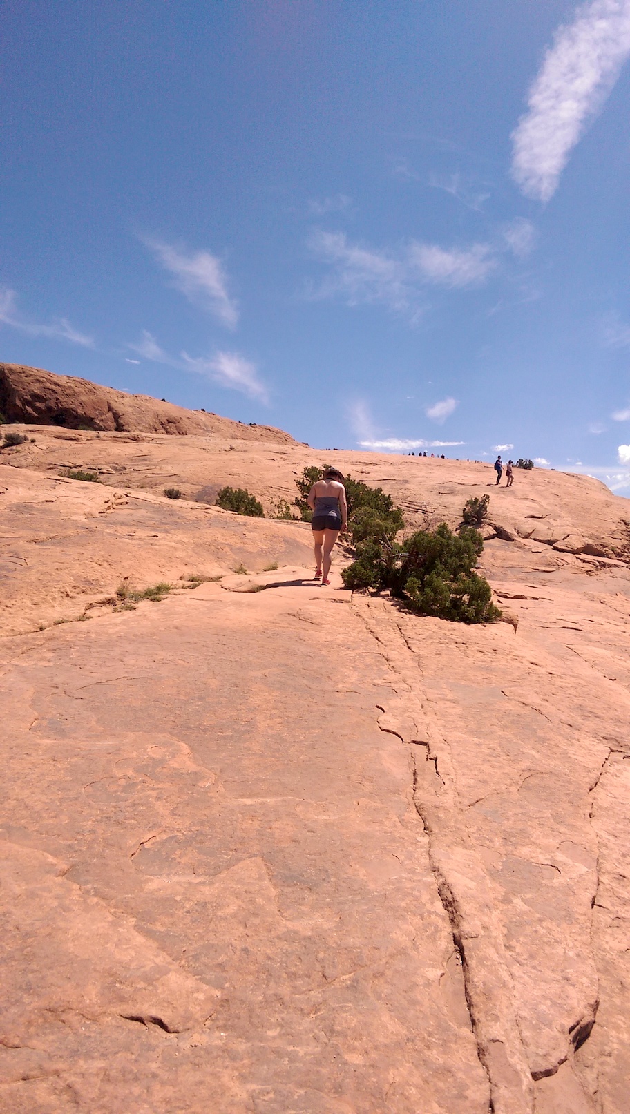 Lämpötila ylitti +30 astetta. Vaelsimme vajaan viiden kilometrin mittaisen matkan nähdäksemme Utahin ylpeyden aiheen. Sen kivikaaren, joka koristaa jokaista Utahin matkaopasta, auton rekisterikilpeä ja julistetta. Delicare Arch. Jokaisen kiipeämismetrin arvoinen nähtävyys. Sitä ei näe puiston autotieltä, se on vähän kuin piilossa kanjonien välissä. Se seisoo korkeana kahden kanjonin välissä. Kaarelle päästäksesi tulee kävellä todella kaltevaa vuoren reunaa pitkin, aivan kuin jyrkkää alamäkeä olisi kävellyt poikittain ei alaspäin.