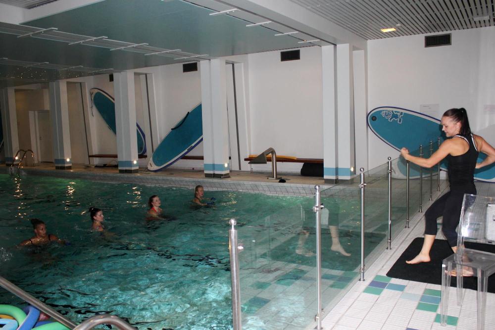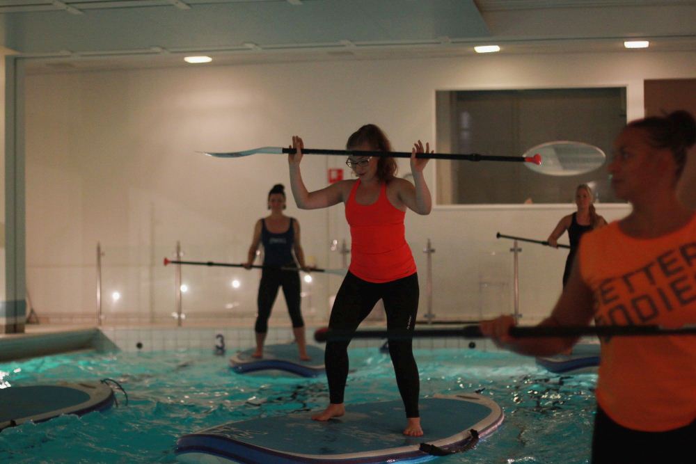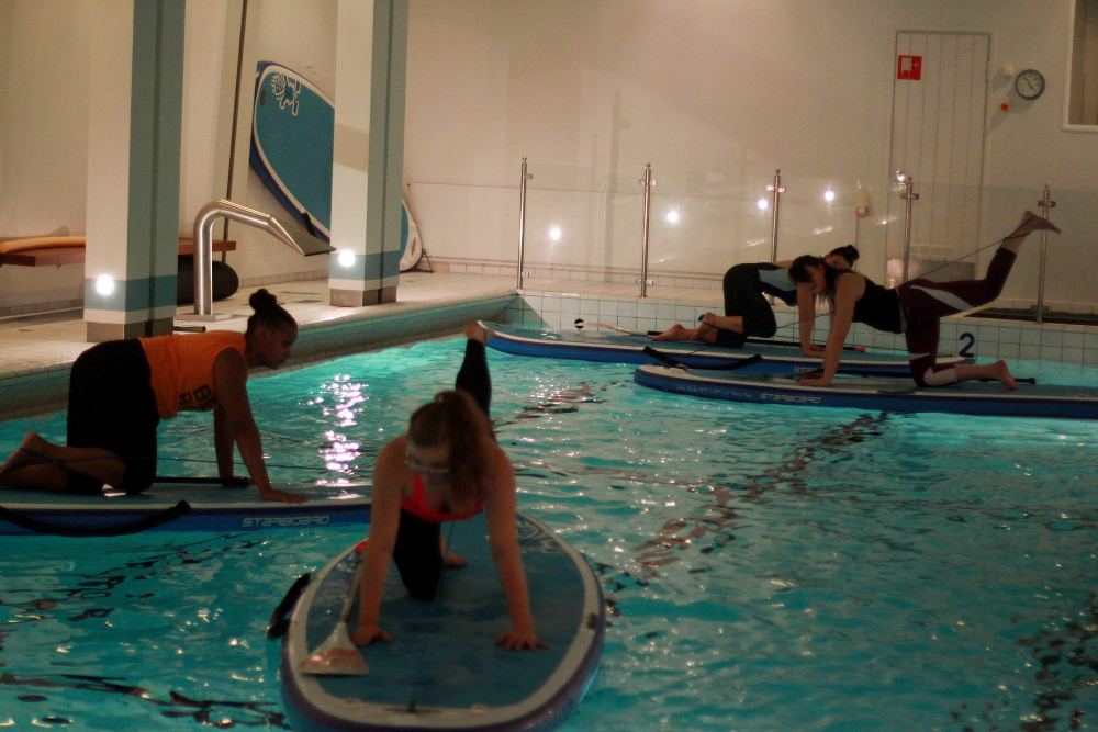 Kierroksen jälkeen alkoi action eli vaatteet vaihtoon ja uima-altaalle. Luvassa oli SUP Fit & Balance -tunti, joka pidettiin siis sisäaltaassa! Ei muutakuin mimmit lautojen päälle ja hikeä pintaan. Olin järkevänä likkana käynyt rääkkäämässä takareidet sekä pakarat ennen illan rientoja, joten laudalla tehdyt kyykyt ja pakarapotkut kyllä osuivat tärinän saattelemana kohdilleen. Olen kerran aikaisemmin kokeillut SUP Joogaamista, joten laudalla toimiminen oli hennossa muistissa. Tasapaino on yksi omista heikkouksistani, yhdellä jalalla tehdyt tasapainoharjoitukset vaativat itseltäni 124% keskittymisen. Noin puolen tunnin mittainen setti oli erittäin napakka, kroppa tunsi tehneensä ja sen näki myös punaa hohkaavasta naamasta.