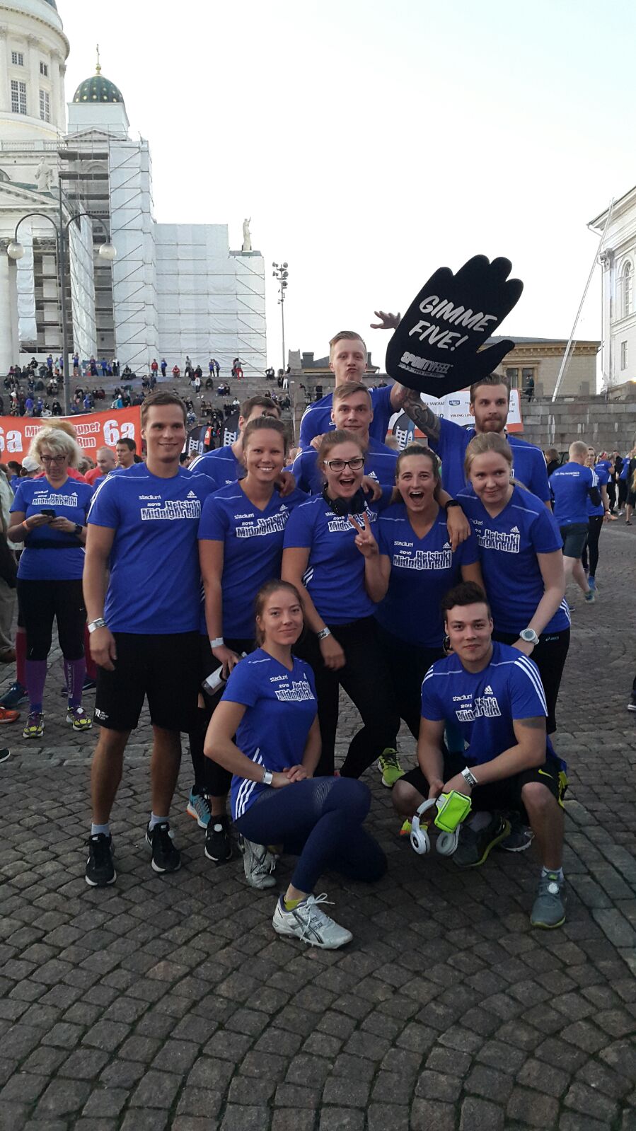 Lauantain aamuvuoro oli täynnä jännitystä. Miten juoksu tulee kulkemaan lyhyiden yöunien ja pitkän päivän päätteeksi? Alittuuko tavoiteaika? Pysynkö työkaverini peesissä vai jäänkö viime vuoden tapaan junasta? Olimme saaneet kasaan ison juoksuporukan täynnä naurua. Pelkästään heidän läsnäolo sai minut rentoutumaan ja unohtamaan edessä olevan koitoksen.
